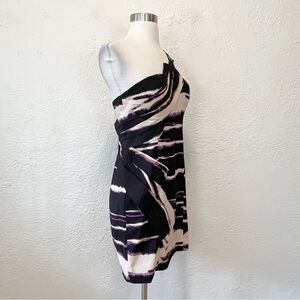 Deadstock NWT vintage dress. Y2K/90s/2010s. Black, purple, cream abstract art brushstroke pattern. One shoulder. Pleated/layering detail. Lined. Zip closure. Padding in the bra area. Rubber at the top trim to help keep in place. NWT. New with tags.