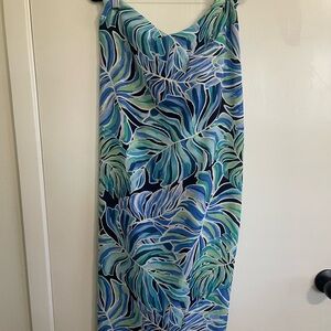 Stylish swimsuit wrap skirt with a vibrant leaf pattern. Features shades of blue and green.