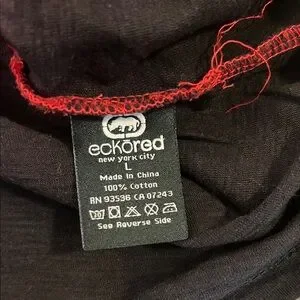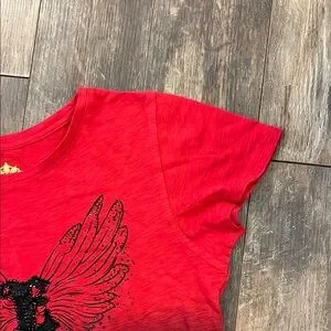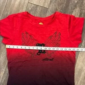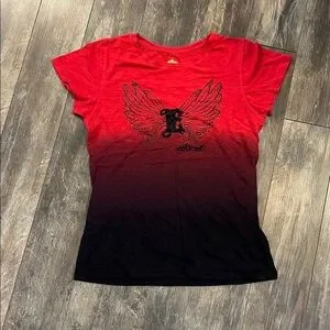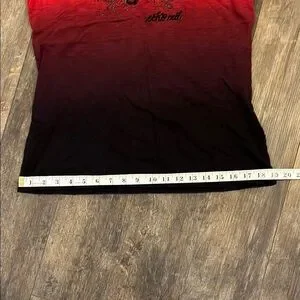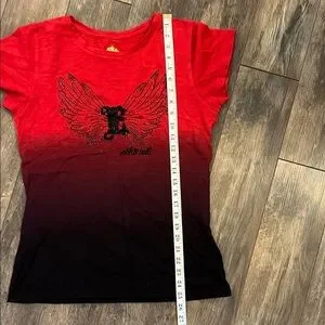 This t-shirt features a unique color gradient design transitioning from bright red to deep black, creating a bold and eye-catching appearance. Made of soft, stretchy material suitable for casual wear.