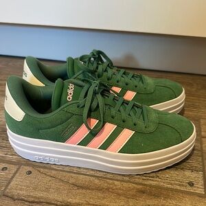 Stylish Adidas sneakers in green with pink accents. Perfect for casual wear. Worn once. Size 8.5