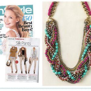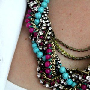 The Beautiful "Bamboleo" necklace from Stella & Dot. Seen on many celebs and fashion bloggers! A color explosion of brightly colored beads and hand braided antiqued chains interwoven with glimmering rhinestones! The colors and detail are just stunning. Retired and rare. Matches any outfit. Outstanding, hand-crafted statement necklace is sure to stand out. So unique in its mix of pink dyed Jade and Turquoise intertwined with other antique type chains. Lobster clasp.