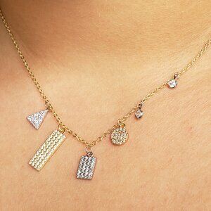 This multi-shaped pave Swarovski Crystal Accented Pendant Necklace got plenty of glam in a delicate form with triangle, rectangle, square and round shapes. Perfect for a special occasion or for everyday wear. NWT. It measures about 8 to 9 inches in length.