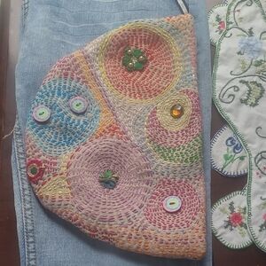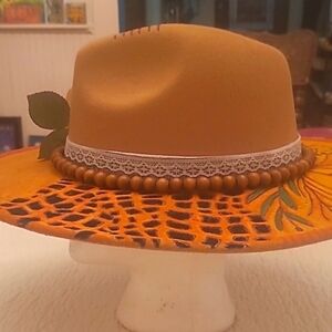 Hand Crafted Beige Orange Floral Bolero Hat Burned Outlines Feathers Flowers