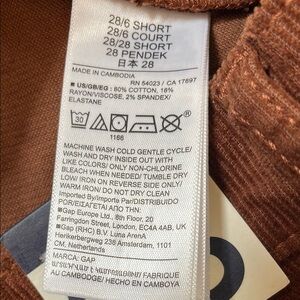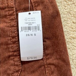 Stylish and comfortable brown corduroy jeans from Gap. They’re soft and have some stretch. Front flat pockets and slight flare at the bottom. Color is a reddish brown. From a smoke and pet free household.