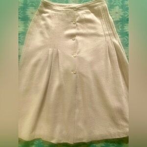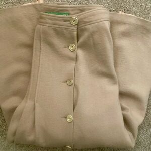 Rendered in a camel / tan neutral, the skirt features a flattering A-line silhouette with crisp pleats and a button-front design that adds subtle structure and vintage charm. Knee length and beautifully proportioned, it transitions effortlessly from office to weekend, day to evening.