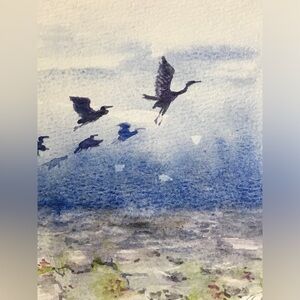 Herons Evoke a sense of tranquility with this original watercolor painting, capturing a flock in graceful flight over a serene landscape. The artist's delicate brushstrokes and the harmonious blend of blues and grays create a calming atmosphere, inviting you to immerse yourself in the beauty of nature. This artwork would be a perfect addition to a living room, bedroom, or office, bringing a touch of natural elegance to any space.