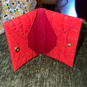 Stylish red croc-embossed wallet by Tory Burch. Features a sleek design with a signature logo. Perfect size for a small bag / clutch. Button snap closure. Like new!