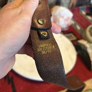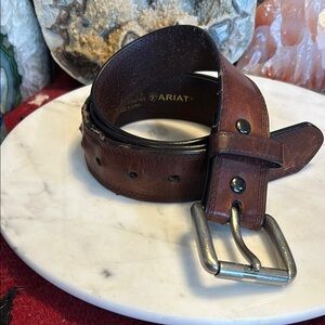 Elevate your style with the Ariat brown leather belt. Crafted for durability and timeless appeal, this belt is perfect for any occasion. It’s vintage and well worn- the holes have some stories to tell!