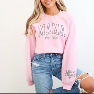 1- crewneck L black with white lettering “MOM est. 2012” on the sleeve “Asher, Noah, Boaz, Brighton” with a heart