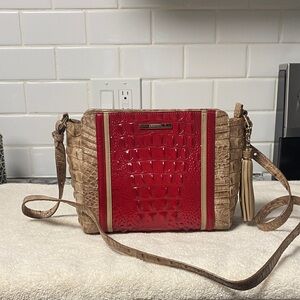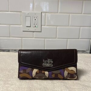 Kate Spade genuine leather shoulder bag with adjustable and removable shoulder straps. Also has a top handle for convenience. The closure is a push lot closure. Also has bottom feet for support has three sections on the inside. The call out it does have some corner rub. This is shown in pictures measures 10 inches across 9 inch height 4 inch width.