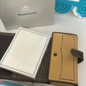 Stylish yellow leather stationary set and wallet by Barrington. Features brown trim and a sleek design.