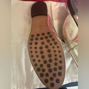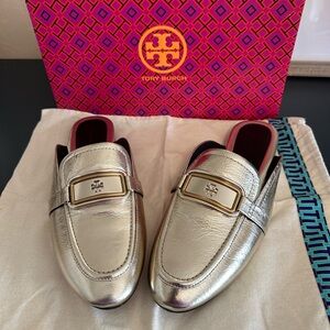 Step out in style with these elegant gold slip-on loafers from Tory Burch. Perfect for any occasion, these shoes offer both comfort and sophistication.