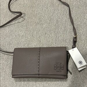 This Tory Burch crossbody bag showcases a sophisticated tan color, crafted from a smooth leather-like material. Its structured rectangular shape and long strap offer both style and practicality, making it an ideal choice for everyday use.