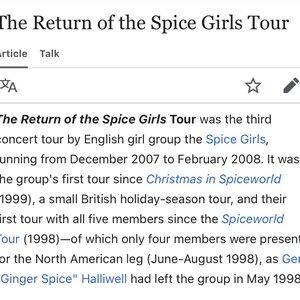 This was purchased on the spice girls reunion tour in 2007. This is the first tour since 1998 that all 5 members performed. this T-shirt was only worn once or twice. It is in great condition for being 18 years old.