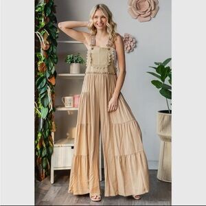 Beige brown khaki ruffle lace embroidered overall flare boho leg wide jumpsuit