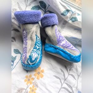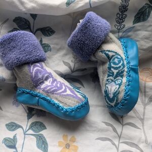 Adorable baby booties with blue soles and purple cuffs. Features a playful native design. like new did not come with tags