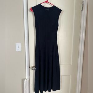Elegant black midi dress by J. Crew. Features a fitted bodice and flared skirt.