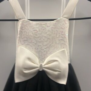 This elegant kids dress features a classic black skirt with a charming white bodice and bow. Perfect for special occasions.