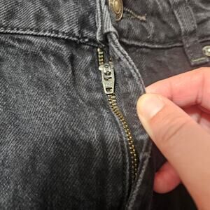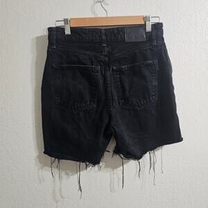 Black distressed high-rise jean shorts. Button and zip closure. 5-pocket styling and belt loops. Originally the 'My Own Lane' jeans. Size 29.