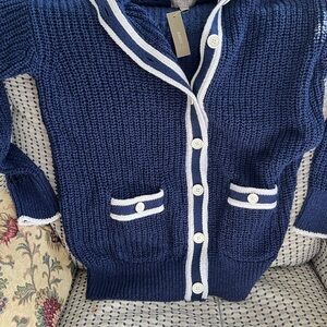 Stay cozy and stylish with this navy blue knit sweater featuring elegant white trim. Perfect for any occasion.