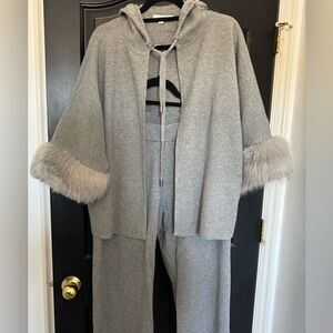 Stylish gray hooded knit jacket and cozy pants with faux fur trim. Perfect for a chic and comfortable look. Chicos size 2, approx ladies 12