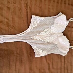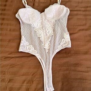 Elegant sheer lace bodysuit in white. Features delicate lace detailing and adjustable straps.