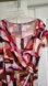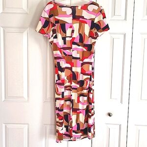 New with tags, never worn: women's dress, faux wrap style, v-neck, approx. 39 inches shoulder to hem. Gorgeous pattern in pink, purple, red, and neutral cream & tan!
