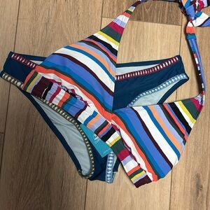 Stylish bikini set featuring a colorful ruffled top and black high-waisted bottoms. Removable pads and straps!! High waisted bottoms!! SUPER CUTE!!