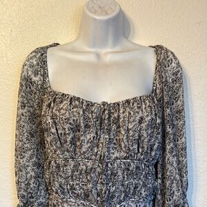 Black and white floral midi length dress from Free People. Square neckline with smocked bodice. Puff sleeves with smocked cuffs. Size XL.
