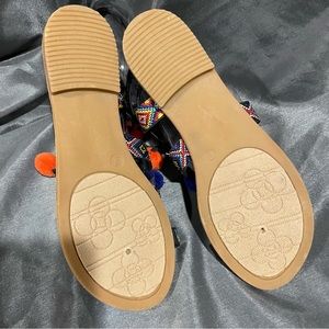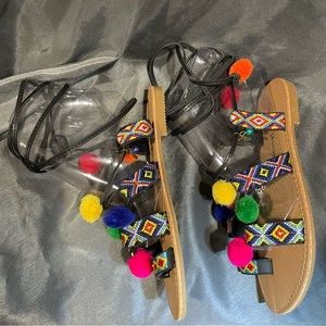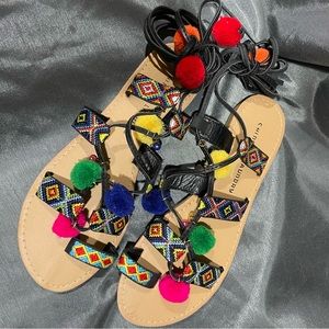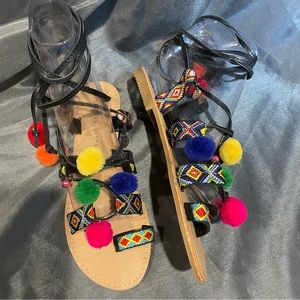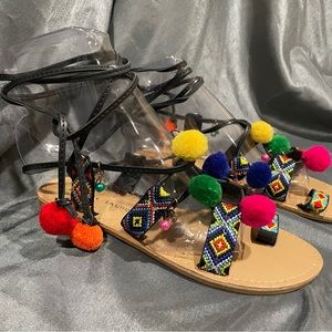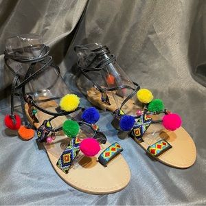 Gorgeous leather leg-tie sandals with intricate beading and pom details.