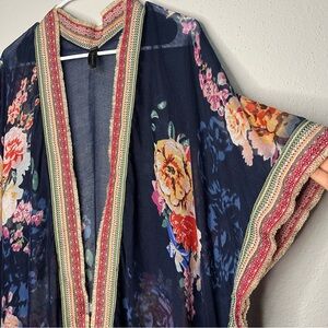 Enhance your style with this elegant floral kimono. Featuring a rich navy base with vibrant multicolor floral patterns, it's perfect for adding a touch of sophistication to any outfit.