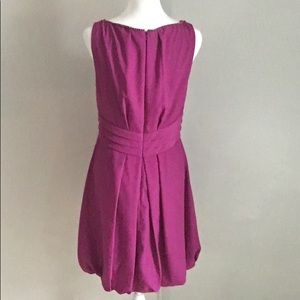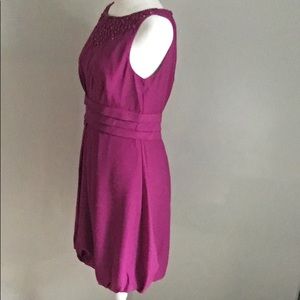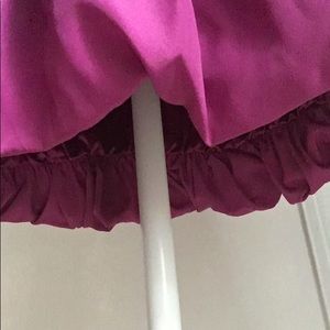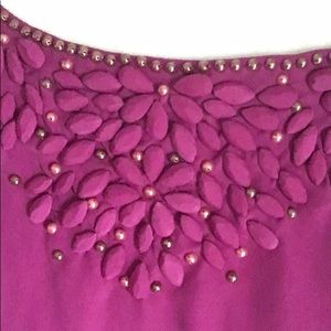 This dress is embellished with cloth covered beads and small pearls around the décolletage. Neckline is fully finished with small pearls. The dress is chiffon and fully lined with a modest bubble hem. Finished with a hook and eye closure. Color - Fuchsia Pink
