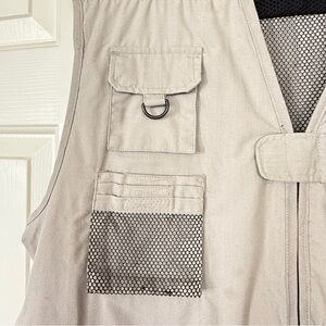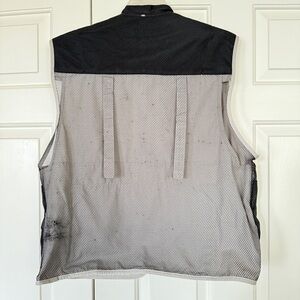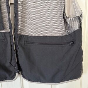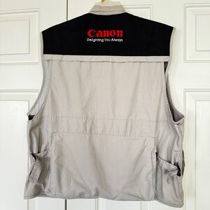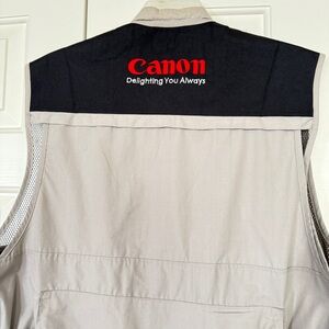Light gray vest with black accents. Features multiple pockets with embroidery EOS Digital logo on front and Canon logo on the backs. Mesh lining and on pocket. Very functional vest best for photography or outdoor events.