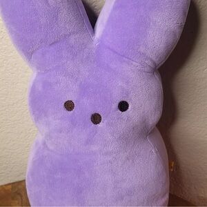 The image shows a purple Peeps bunny plush. Peeps are marshmallow candies that are especially popular around Easter. While the original Peeps were yellow chicks, they now come in various colors and shapes, including bunnies. This plush version replicates the bunny shape with its long ears and rounded body, and it features brown embroidered eyes and nose. Plush toys like this can be washed in a washing machine inside a mesh bag or pillowcase on a delicate cycle with cold water and mild detergent.