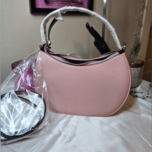 This is an absolutely gorgeous bag. The color is a beautiful baby pink that is a little more vibrant than it may look in the pics. It's made of very soft, high-quality leather.