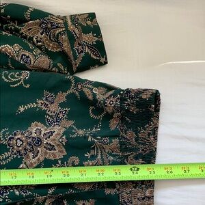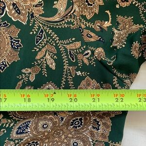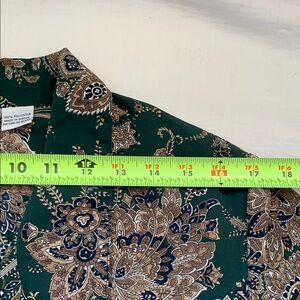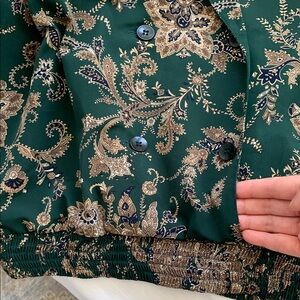 VTG. ALFRED DUNNER Elegant green blouse with gold floral patterns. Perfect for any occasion. It is so unique with 4 buttons to open front and spring on bottom for expend. It looks expensive and made by high quality polyester. It includes shoulder pads and can be removed easily. It is in excellent condition.