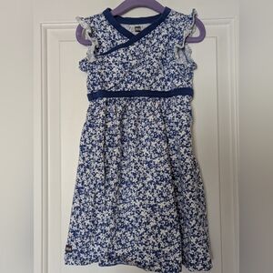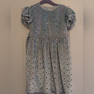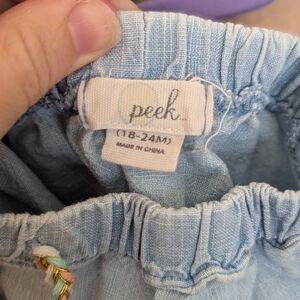 The most adorable girls shorts by Peek in size 18-24m. Wide leg makes it appear like a skirt. Stylish soft light blue denim has colorful yellow/pink embroidery. May have a faint stain as pictured, but it is not particularly noticeable IMO. Some fraying on strings.