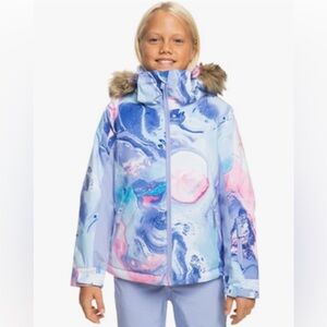 The Roxy Girl Dri-Flight American Pie Snow Jacket in Blue Landscape is a stylish and functional outerwear option for girls. Made with 100% polyester outer shell and lining, this jacket provides warmth and comfort on cold days. The colorful landscape pattern adds a fun and vibrant touch to the design. With features like a removable hood, sleeve zip pocket, and insulated construction, this snow-ski jacket is perfect for keeping young girls cozy and protected during outdoor activities.