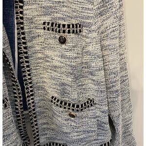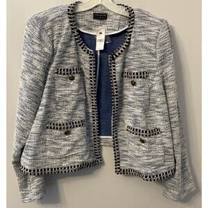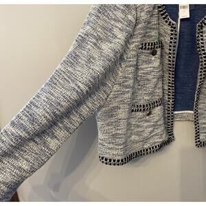 This Lane Bryant blazer is a stylish addition to any wardrobe. The silver and black faux tweed pattern gives it a classic look, while the open front and long sleeves make it a versatile piece that can be worn for any occasion. The blazer is made from 45% polyester, 33% acrylic, 19% rayon, and 3% other materials, and it features a polyester lining and button accents.