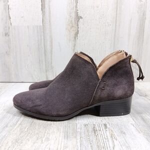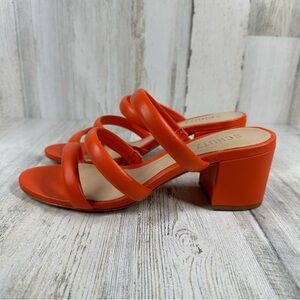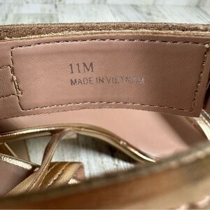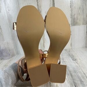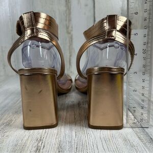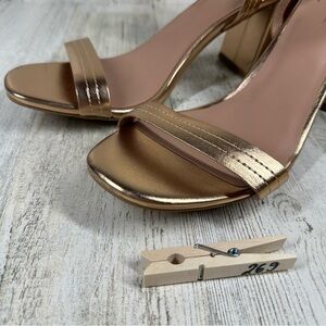A metallic accent at the heel brings an extra flash of glamour to this modern ankle-strap sandal.