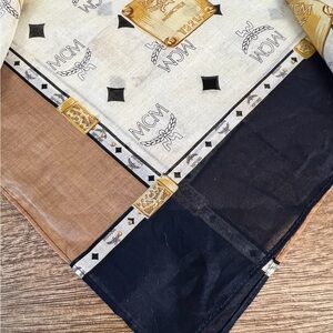 EUC Authentic Pre-Loved MCM Bandana Scarf. Beautiful navy & tan scarf featuring the gold MCM plate logo. 100% cotton. Wear as a bandana, tie it onto your ponytail, attach it to your bag for an extra pop of color. So many uses! Please see all photos for condition. Non-smoking, no pets home. Usually ships out same or next business day. A148