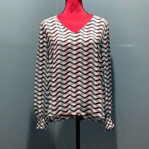 Stylish chevron patterned blouse with long sleeves with elastic cuffs. Features a mix of black, white, and teal colors, 20 inches pit to pit, 26 inch length , great condition
