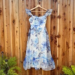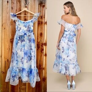 White and Blue Floral Organza Off-the-Shoulder Midi Dress ๐ฟ