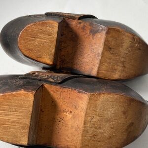 Antique black wooden child sized pair of clogs sabots w/ embossed brown leather