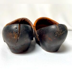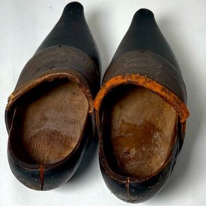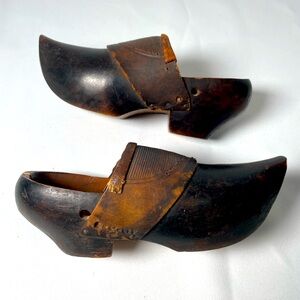 Antique pair of black wooden child sized clogs or sabots with embossed brown leather detail. Truly rustic and unique - this pair of small wooden shoes most likely date well more than 100yrs old. Great item for collectors of antiques! Would be a lovely bit of antique decor for a child’s room or podiatrist’s office.