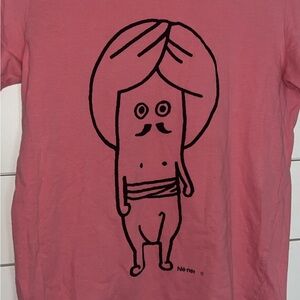 This Issey Miyake tee in a soft pink hue features a playful cartoon graphic on the front, adding a whimsical touch to your casual wardrobe. Crafted from a comfortable, cotton-like material, it offers a relaxed fit perfect for everyday wear.