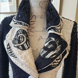 This stylish women's jacket features a striking blue and white design, perfect for any occasion. The elegant contrast adds a touch of sophistication to your wardrobe.