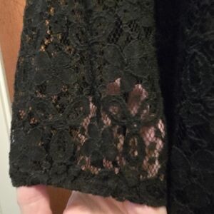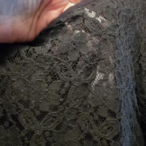 This elegant black lace dress is perfect for any occasion. Its intricate design and classic color make it a versatile addition to your wardrobe. This has an attached lining with intricate lace hemline and long sleeves. I purchased this while in Korea and never wore it. It has no defects other than, in my opinion, the bottom lace is a different black than the rest of the dress. This doesn't take away from its beauty, though. There is little to no stretch. The tag states XL buteasures & fits like a medium. The approximate unstretched measurements;