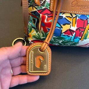This small bag is in mint condition. It's a Dooney & Burke Sandbar Tropical limited edition. The crossbody strap got ruined with an oil. But you can get replacements on Amazon. The bag fabric is nylon and the handles, key chain and tassels are all real leather.