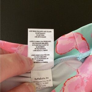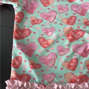 Ruffle Butts Rash Guard Swim Shirt. Size 6. Adorable kids swim shirt featuring a playful pink heart print on a mint green background. Short sleeves. Excellent pre-owned condition. Material and care instructions included in the pictures. Approximate dimensions when laid flat: Length- 17”, Chest- 12.5”.